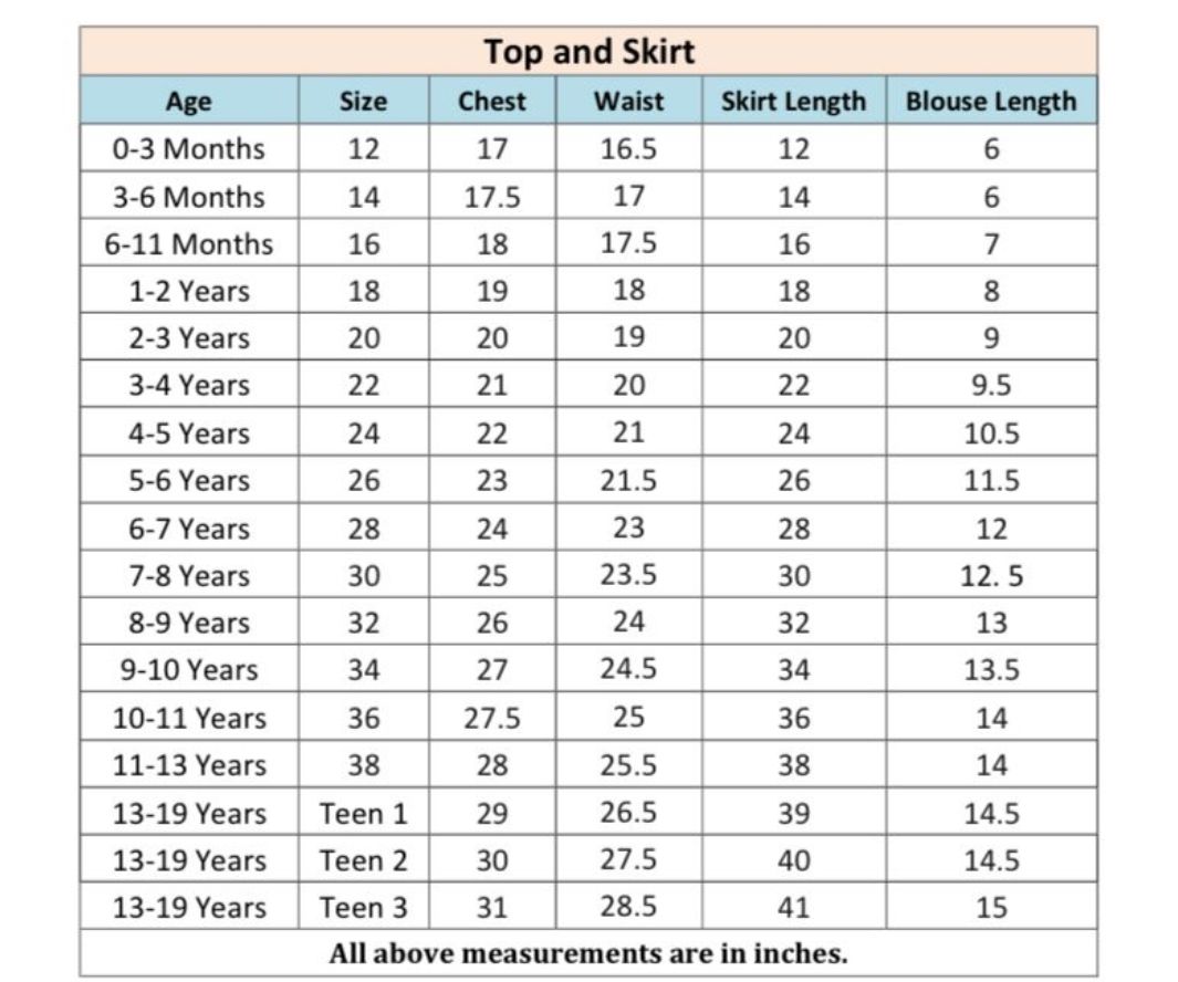 14 (0-6 month), 16 (6-12month), 18 (1-2year), 20 (2-3year), 22 (3-4year), 24 (4-5year), 26 (5-6year), 28 (6-7year), 30 (7-8year), 32 (8-9year), 34 (9-10year)
